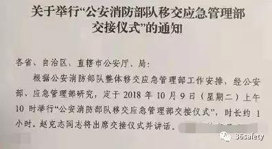 據(jù)多家媒體披露,根據(jù)公安消防部隊整體移交應(yīng)急管理部工作安排,經(jīng)應(yīng)急管理部、公安部部門研究,定于2018年10月9日(周二)上午10時舉行“公安消防部隊移交應(yīng)急管理部交接儀式”,時長約1小時,公安部部長趙克志將出席交接儀式并講話,主會場設(shè)在公安部機關(guān)樓。