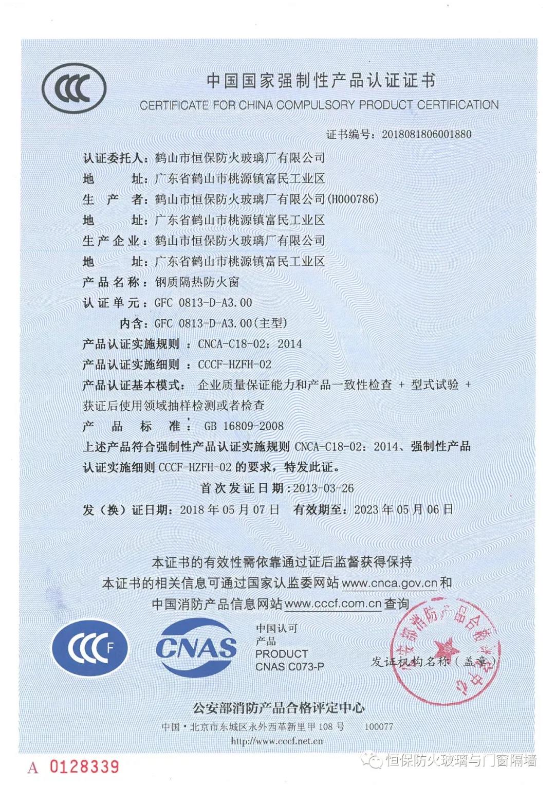 截止2018年10月,已獲得國家“CCCf”主型產(chǎn)品認證證書36張,評定中心網(wǎng)上公告報告55份,四川中心公告26份,天津中心公告2份,英標(biāo)、歐標(biāo)、澳標(biāo)、美標(biāo)檢驗報告35份評估報告20份,耐火窗等其他性能測試報告16份,恒保公司共獲報告154份涵蓋0.5小時至4小時防火系列產(chǎn)品,并擁有防火玻璃與門窗類專利21項。