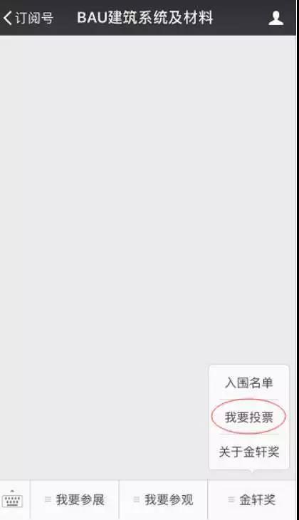 進(jìn)入微信,找到“BAU建筑系統(tǒng)及材料”點(diǎn)擊右下方“金軒獎(jiǎng)-我要投票”欄目進(jìn)入投票頁面進(jìn)行投票。