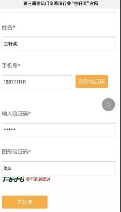 進(jìn)入投票頁面,彈出實(shí)名制個(gè)人信息填寫表格——請?zhí)顚懲暾麄€(gè)人信息,點(diǎn)擊獲取驗(yàn)證碼并輸入后提交。