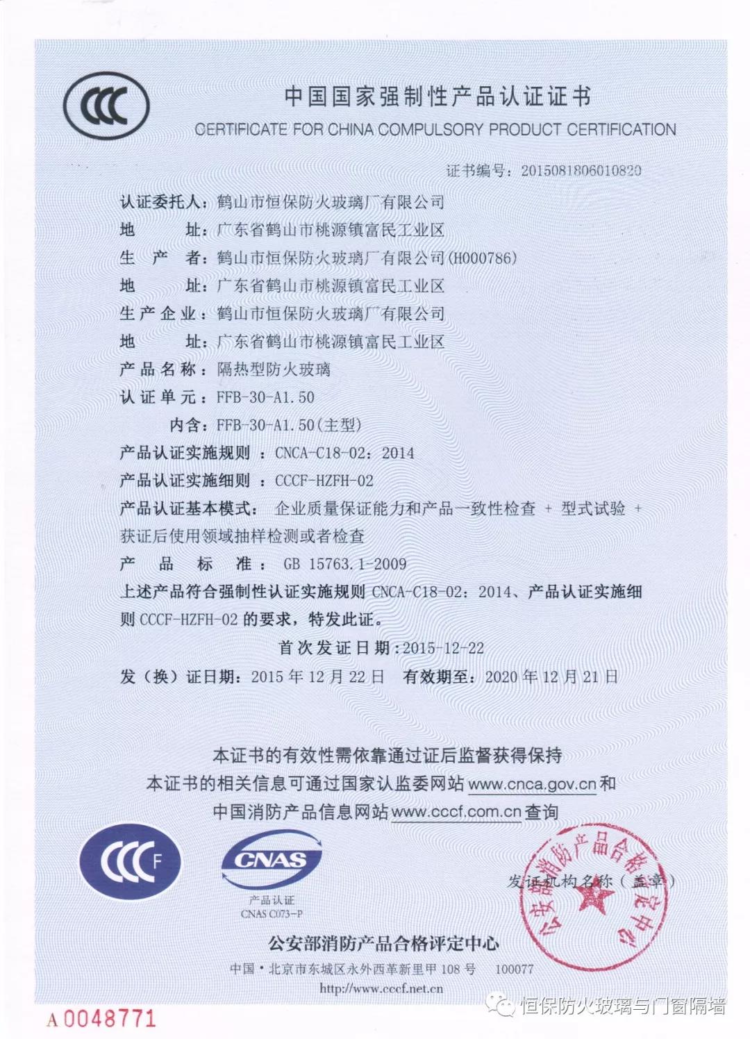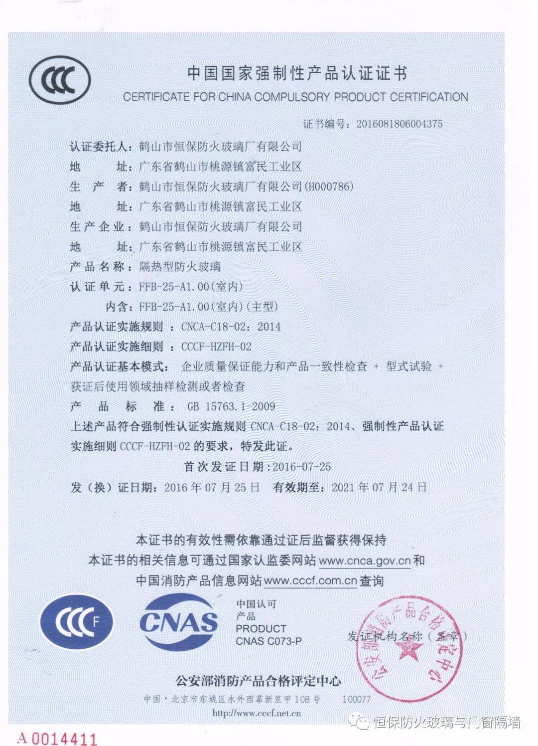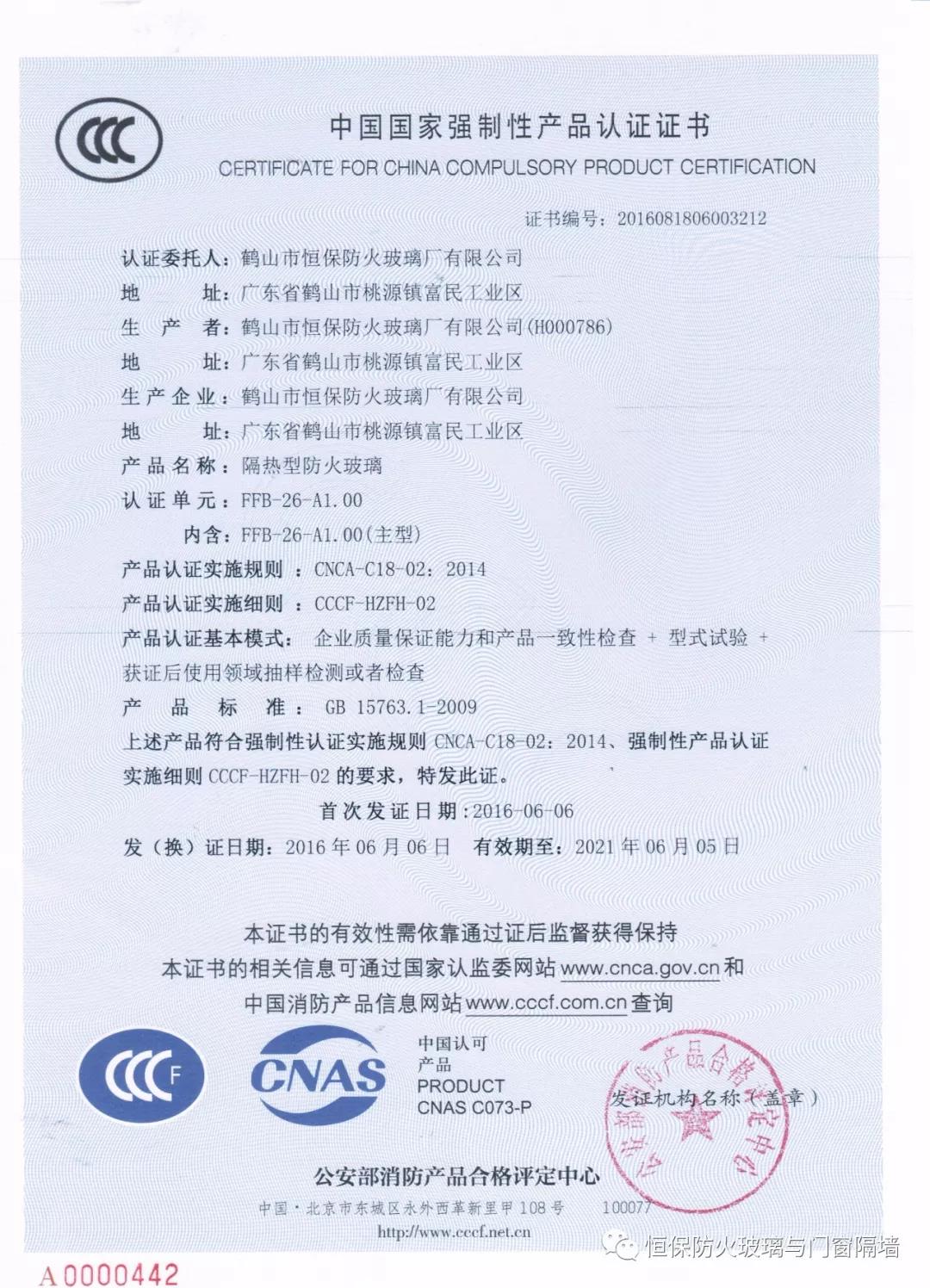 截至2017年7月,恒保已獲得國(guó)家“CCCf” 主型產(chǎn)品認(rèn)證證書31張,評(píng)定中心網(wǎng)上公告報(bào)告51份,四川中心公告11份,英標(biāo)、歐標(biāo)、澳標(biāo)、美標(biāo)報(bào)告29份評(píng)估報(bào)告18份,耐火窗報(bào)告4份,共計(jì)113份涵蓋0.5小時(shí)至4小時(shí)防火玻璃系列產(chǎn)品,防火玻璃與門窗類專利17項(xiàng)。