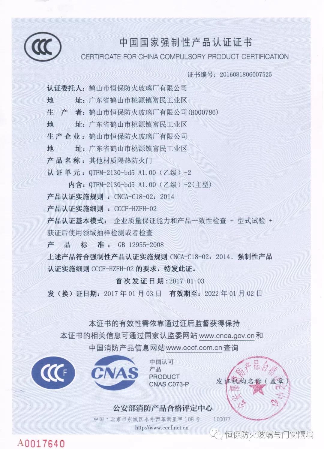 2)防火窗、防火門、防火玻璃非承重隔墻、擋煙垂壁等列入國(guó)家強(qiáng)制性認(rèn)證產(chǎn)品名錄的:需有CCC認(rèn)證證書和型式試驗(yàn)報(bào)告;