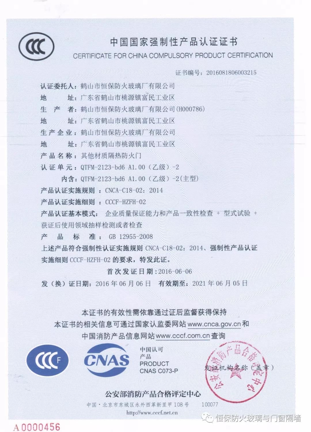 5、恒保公司一共6個(gè)產(chǎn)品獲得國(guó)家3C認(rèn)證證書,其中大版面玻璃防火門2100mmX3000mm;