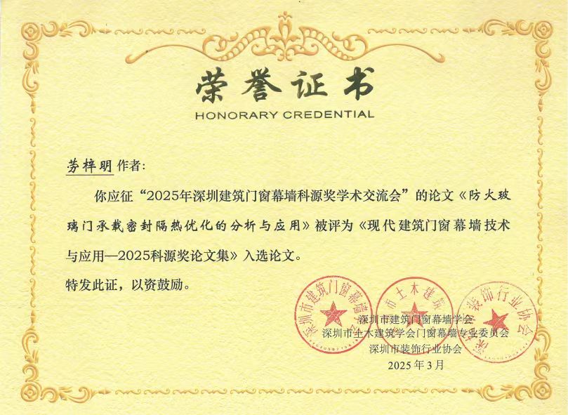 在2025科源獎(jiǎng)獲獎(jiǎng)學(xué)術(shù)論文及學(xué)術(shù)交流先進(jìn)單位頒獎(jiǎng)儀式中,恒保公司共3篇論文榮獲學(xué)會(huì)表彰,其中工程師勞梓明撰寫的《防火玻璃門承載密封隔熱優(yōu)化的分析和應(yīng)用》被評為《現(xiàn)代建筑門窗幕墻技術(shù)與應(yīng)用——2025科源獎(jiǎng)?wù)撐募啡脒x論文!